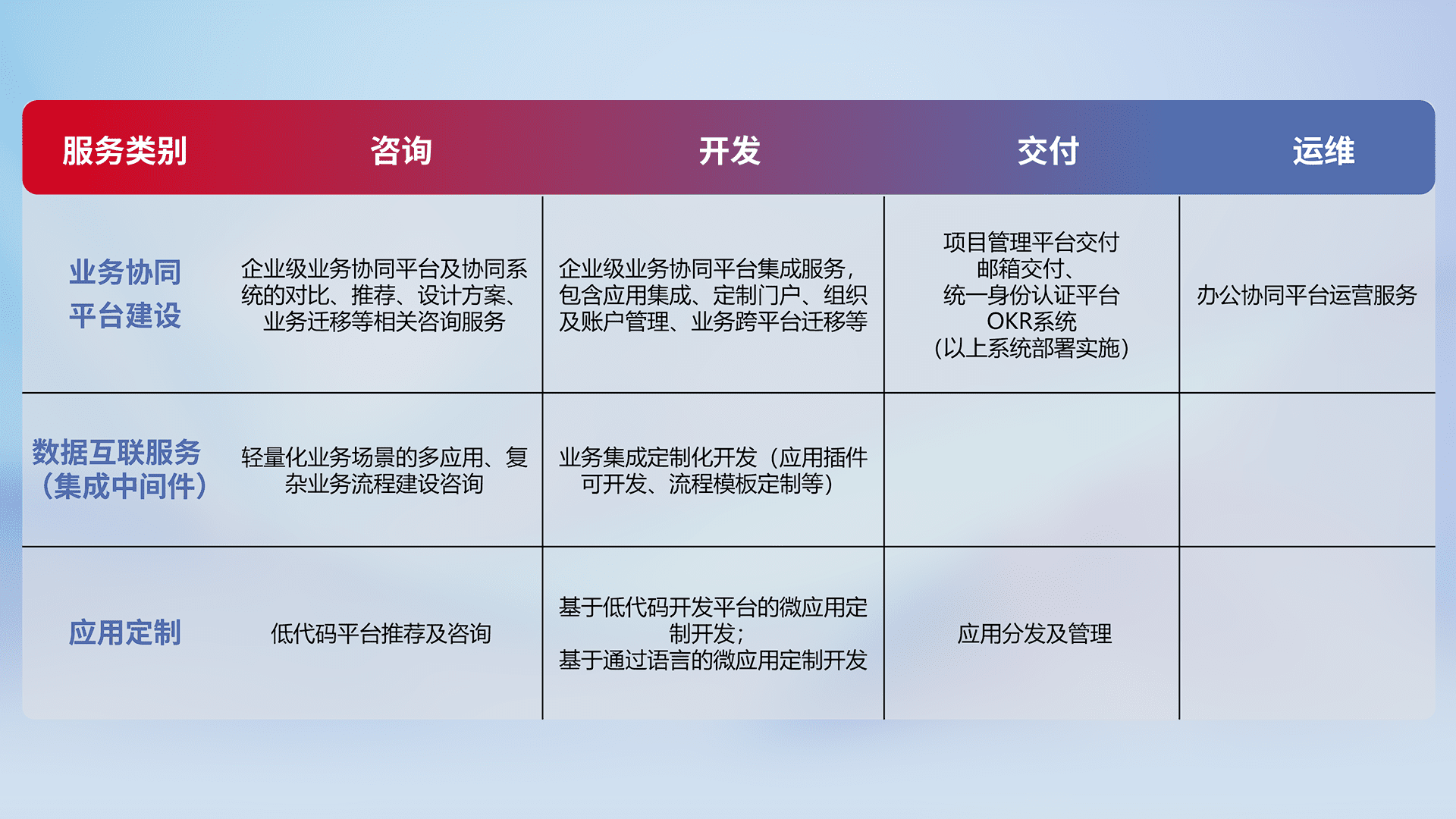 针对钉钉、、、、企微、、、、IDaas等平台级产品提供产品的规划、、方案、、交付、、、、定制化开发等服务,,,,实现如统一协同办公、、、、智能客户服务、、、混合会议管理、、智能数据查询、、、、等业务场景,,实现数字化转型。。。